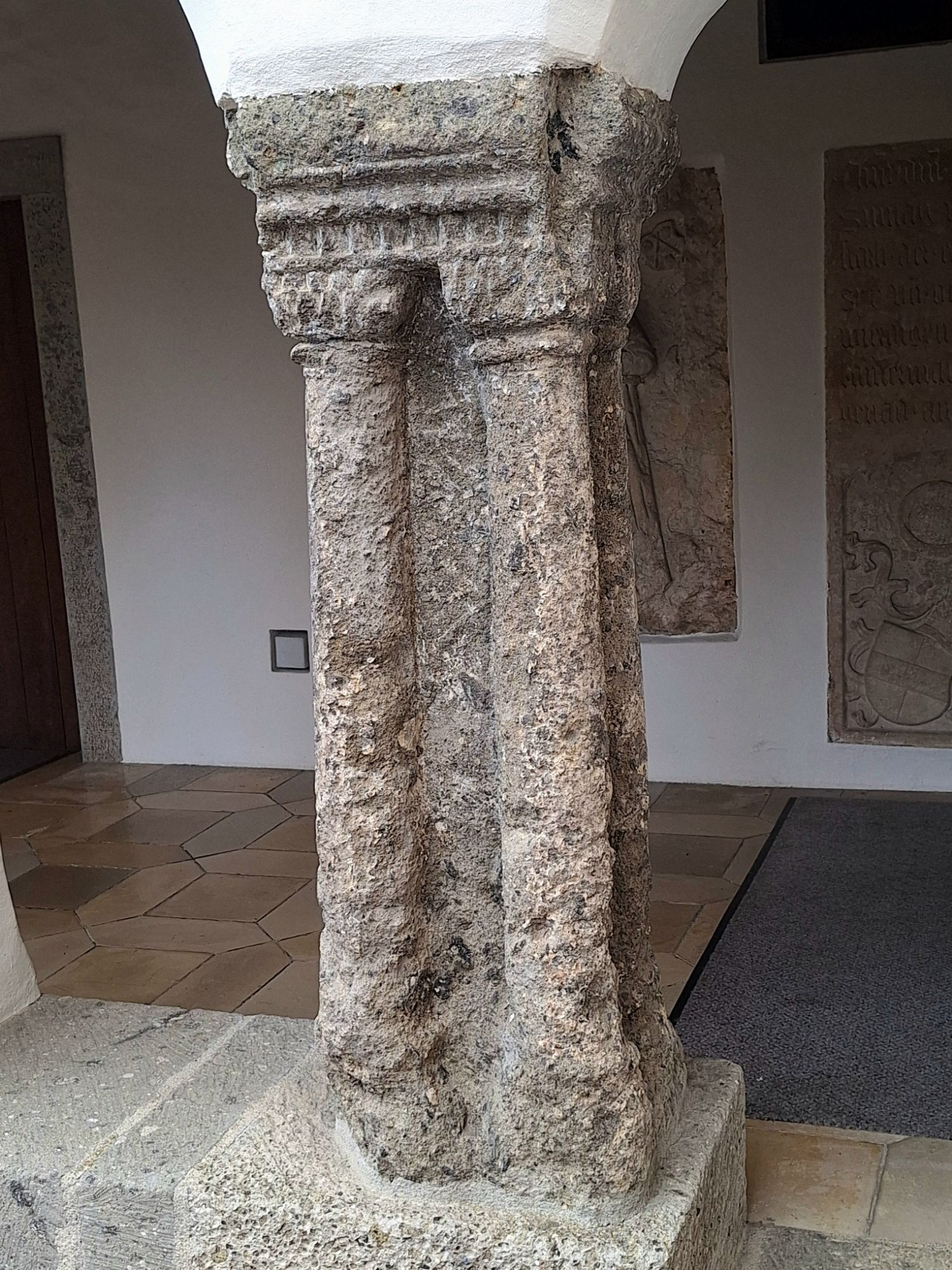 Von den Mönchen zu einer Heiligen: 893 hatte das Benediktinerinnenkloster Monheim die Reliquien der Heiligen Walburga bekommen, die rund 100 Jahre zuvor im Kloster im mittelfränkischen Heidenheim das Zeitliche gesegnet hatte. Deren Gebeine lösten einen regelrechten Boom aus: Monheim zählte zu den populärsten Wallfahrtsorten des Mittelalters. Von diesem Glanzzeiten zeugt heute noch der idyllische Kreuzgang, den man durch eine Seitentür der Walburgakirche aus erreicht. Die unverputzte romanische Säule dort lässt  die Aera des Klosters vor dem inneren Auge wiederauferstehen.