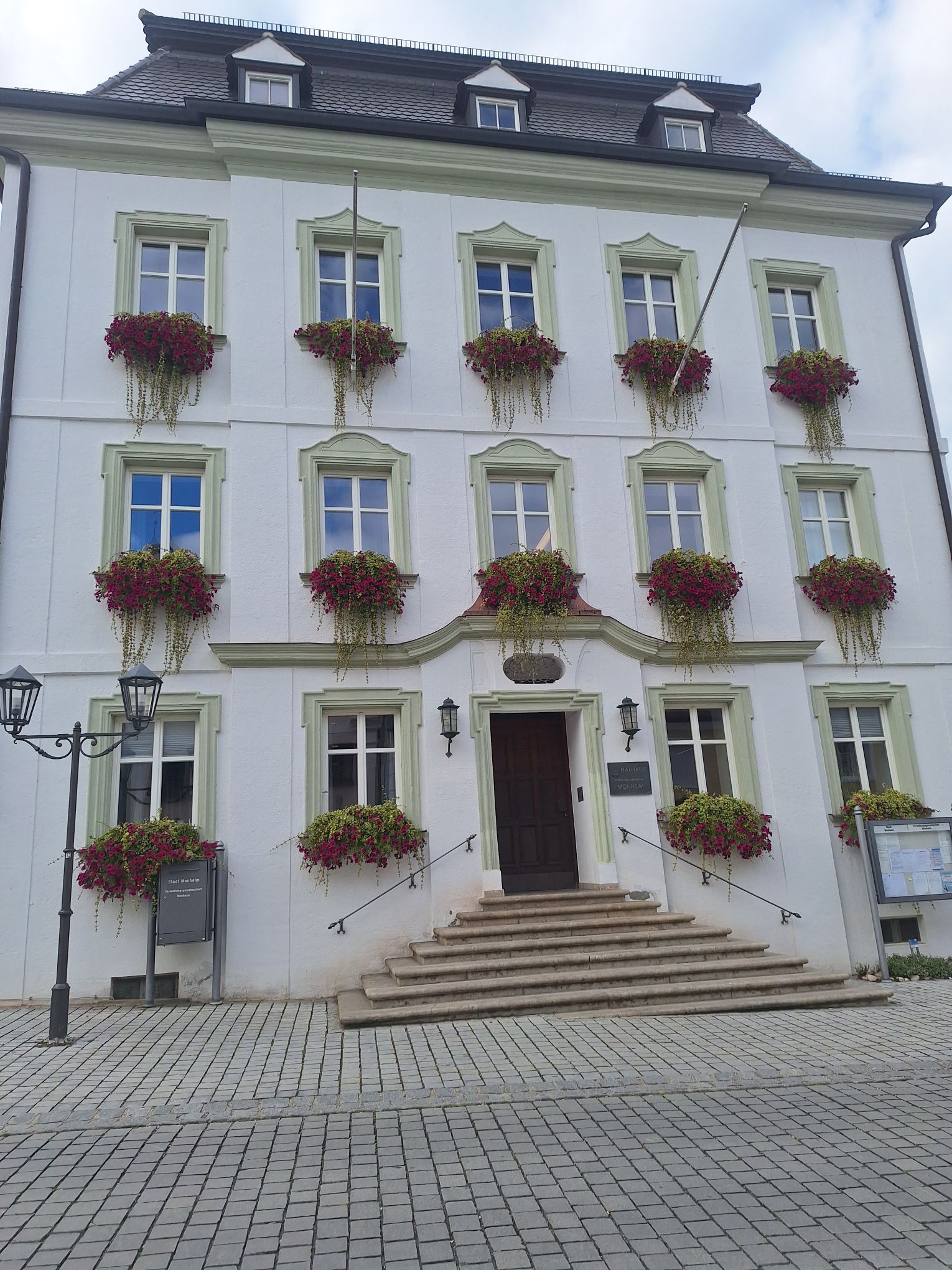 Dafür, dass der romantische Ortskern die Wirren des Krieges heil überstanden hat, kann man auch als Radler dankbar sein. Innerhalb der Stadtmauern geht es noch gemütlich zu, und bei einer Rast kann man die Blicke und die Gedanken schweifen lassen. Zum Beispiel auf das wunderschöne Rathaus, das der jüdische Kaufmann Abraham Elias Model von 1714 bis 1720 errichten ließ. Im ersten Stockwerk kann man dort (in den beiden Sitzungssälen sowie dem Trauzimmer) wunderschöne Stuckdecken aus der Wessobrunner Schule bewundern. Sie zeigen Szenen aus dem Alten Testament.