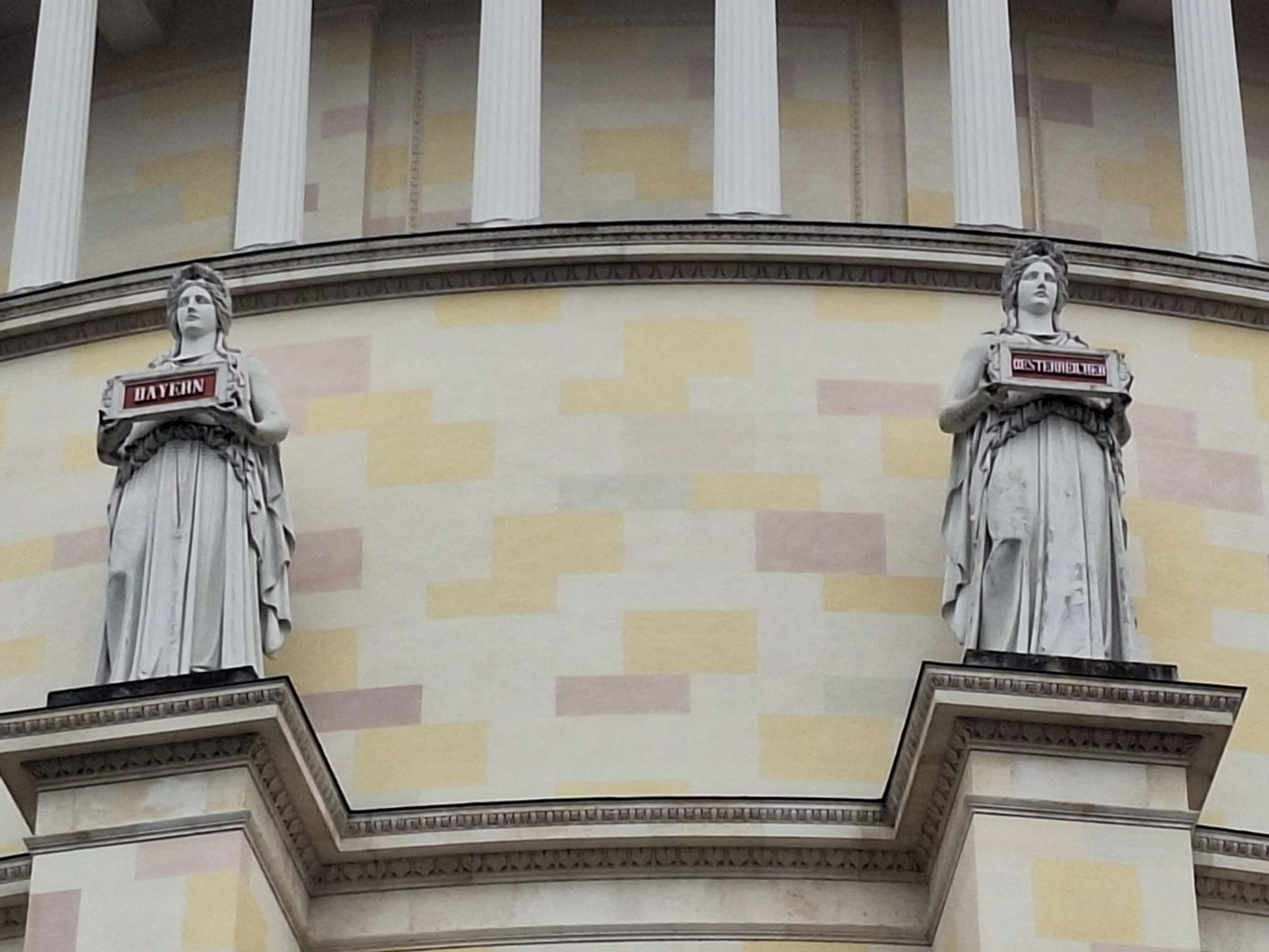 Nichts ist an und in diesem monumentalen Bauwerk ohne Symbolik, nichts ohne Botschaft: So ließ der König bei den 18 Frauenfiguren, die die deutschen Volksstämme repräsentieren, deren Truppen 50 Jahre vor Fertigstellung der Halle 1813 in der Völkerschlacht bei Leipzig Napoleon niedergerungen hatten, Bayern und Österreich nebeneinander platzieren. Ludwig war zwar ein Befürworter der deutschen Einheit, wollte die indes durch die (durch den katholischen Glauben verbundene) Donau-Achse dominiert sehen – allen Streitereien zuvor (und danach) zum Trotz…