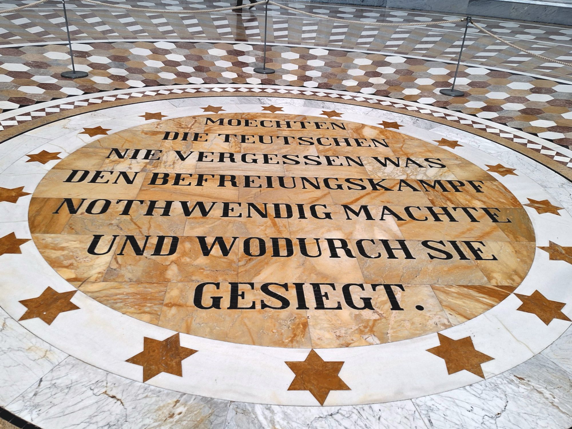 Das Innere wurde gewissermaßen als „Dom des Patriotismus“ gestaltet. Die Kuppel, die eine Höhe von 45 Metern erreicht, empfand der Monarch wie das Himmelsgewölbe, das schützend über den vereinten deutschen Stämmen stehe. 34 Siegesgöttinnen aus weißem Carrara-Marmor reichen sich am Rande der Kuppel die Hände. Schließlich sollte ja der „deutsche Fleckerlteppich“ überwunden werden. Die 17 vergoldeten Schilde zwischen ihnen hatte man aus der Bronze eingeschmolzener erbeuteter französischer Kanonen gießen lassen. Und in der Mitte des Fußbodens ließ Ludwig seine zentrale Botschaft an die Nachkommenden verewigen: „Möchten die Deutschen nie vergessen, was den Befreiungskampf notwendig machte und wodurch sie gesiegt.“